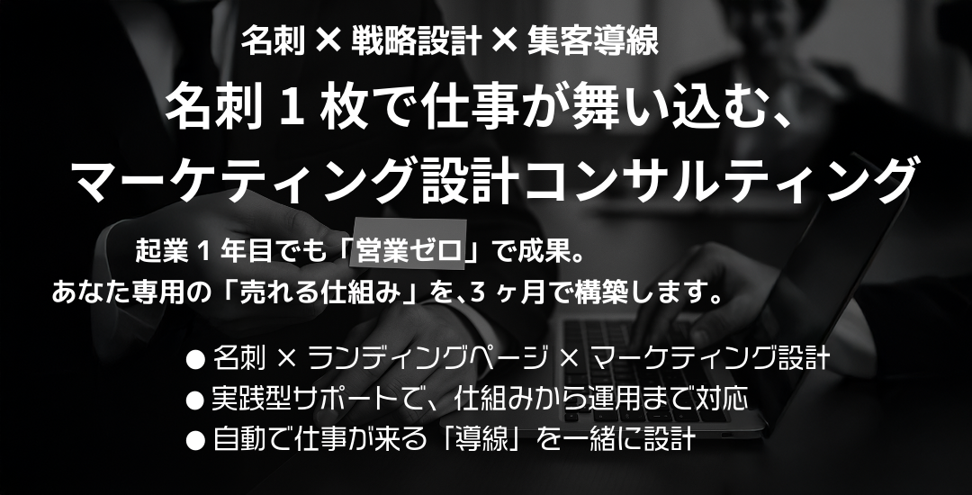 「名刺を起点にした集客・成約のしくみ」を、完全マンツーマンで構築する3ヶ月集中サポート。